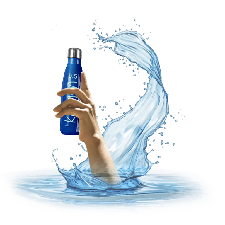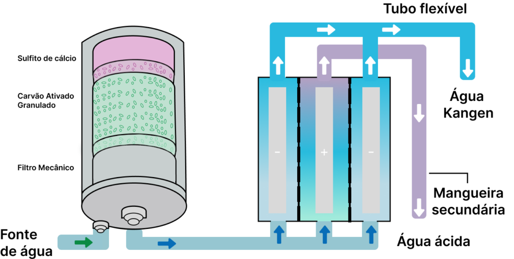 El agua filtrada pasa por varias placas de electrodos y membranas, separándose en sus partes ácida y alcalina. Se divide en OH- (iones hidróxido) y H+ (iones hidrógeno).